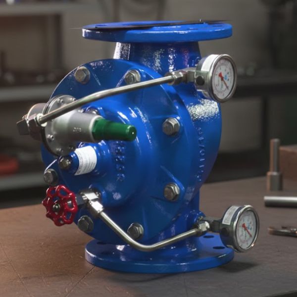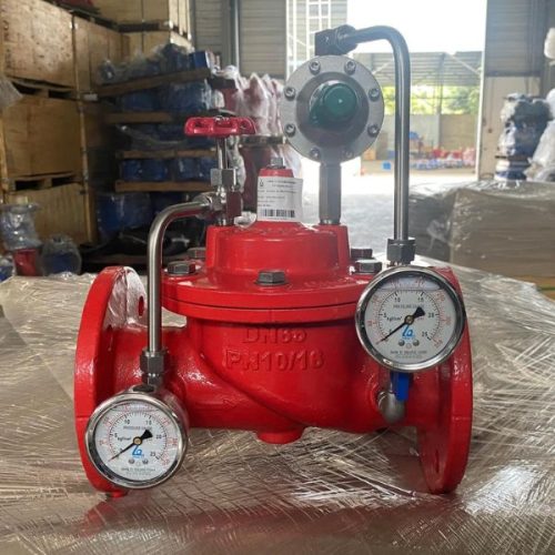 - Khi áp suất đầu ra vượt ngưỡng cài đặt, pilot tác động lên buồng màng, điều chỉnh tiết diện dòng chảy và đưa áp suất về mức ổn định.