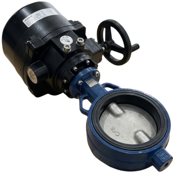 - Bộ điều khiển actuator điện vỏ đen dạng trụ đi kèm tay quay phụ dùng để thao tác khi mất điện. Đây là đặc điểm chỉ xuất hiện ở các van bướm điện cỡ lớn, nơi mô-men xoắn đóng mở vượt khả năng của motor nhỏ.